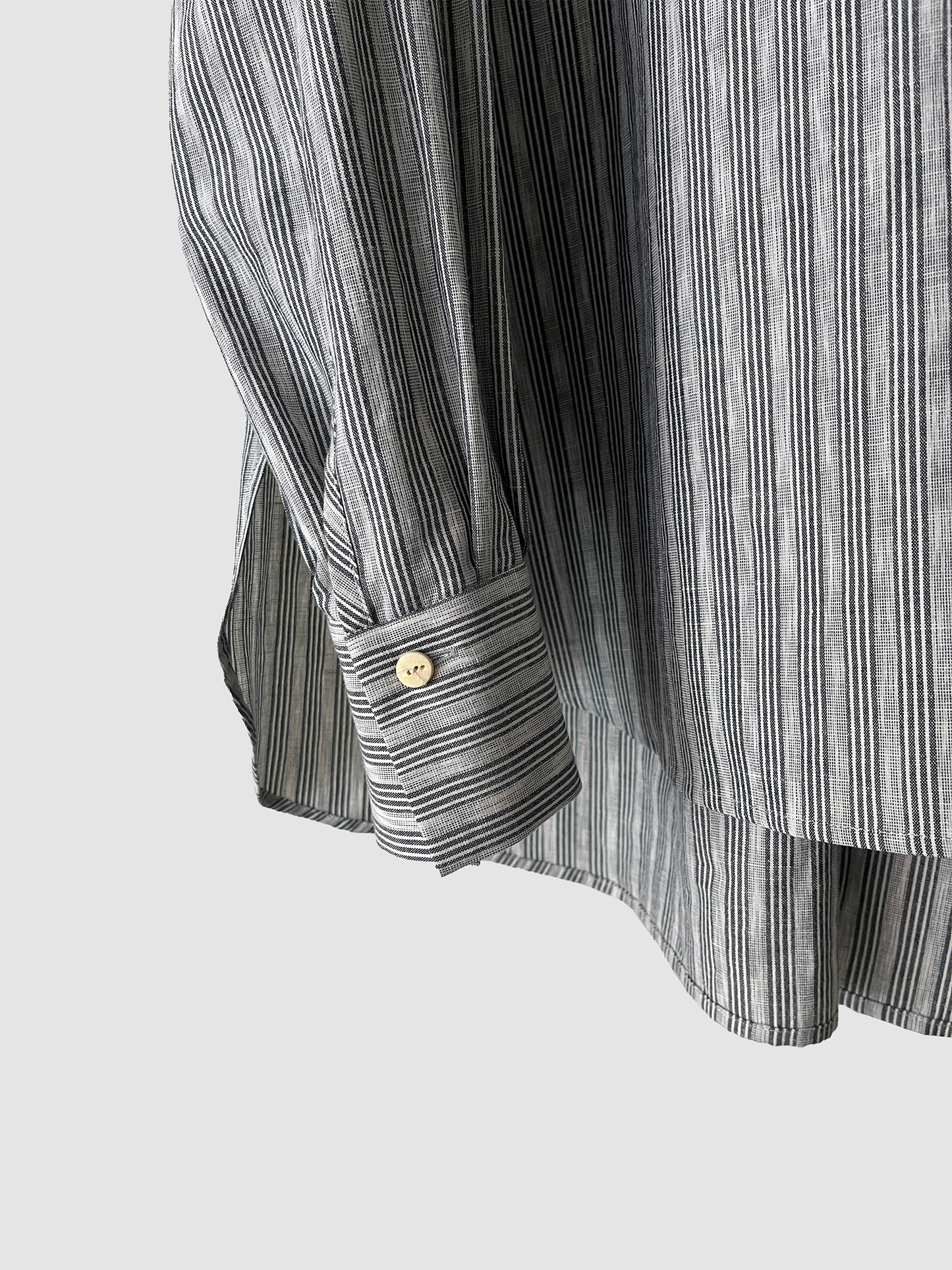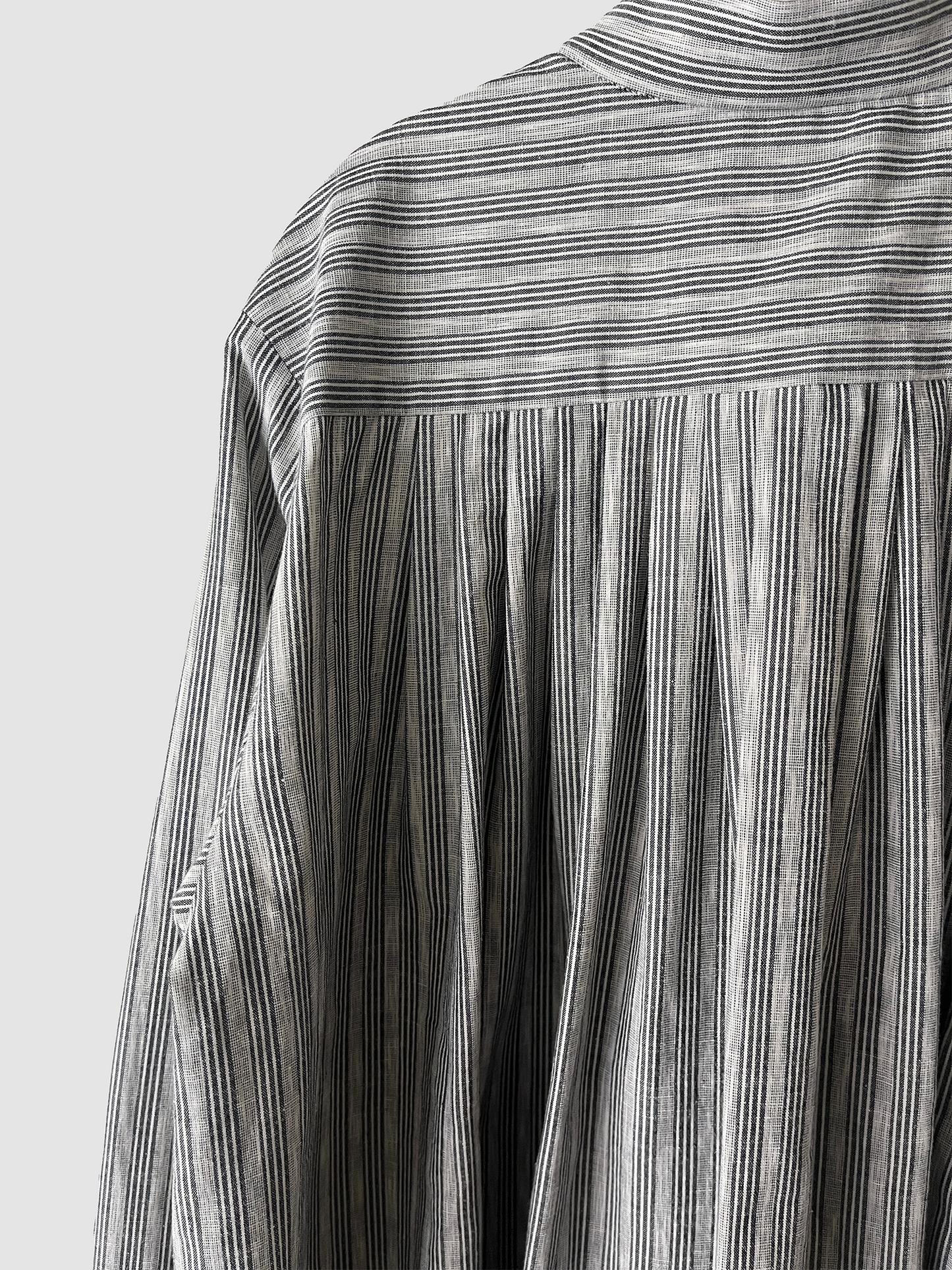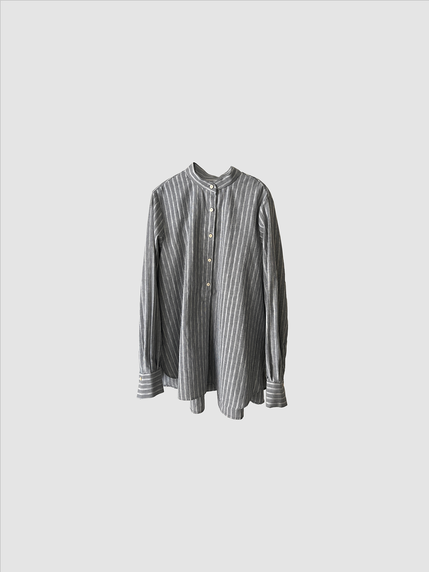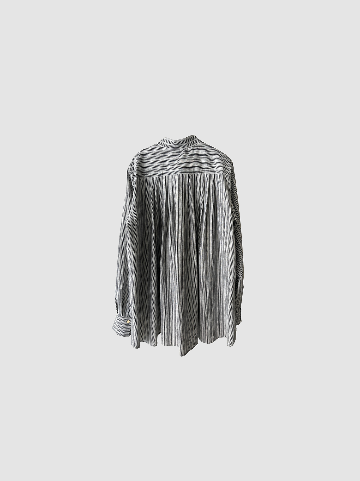 TULIP EN MENSENの定番の裾にかけて末広がりなAラインのスタンドカラープルオーバーブラウス。背中の切り替えにタックをたっぷりとはいり、程よくボリュームのありきれいなドレープが生まれます。首周り、肩周りはすっきりとしたパターンでボタンを開けて上品な佇まいです。裾周りは大きなカーブを描き、後ろが長いシルエットです。カフスは長めの作りになっているので袖の膨らみのコントラスを演出し、カフスを一折りしてアクセントにすることも出来ます。ボタンには水牛ボタンを使用しています。