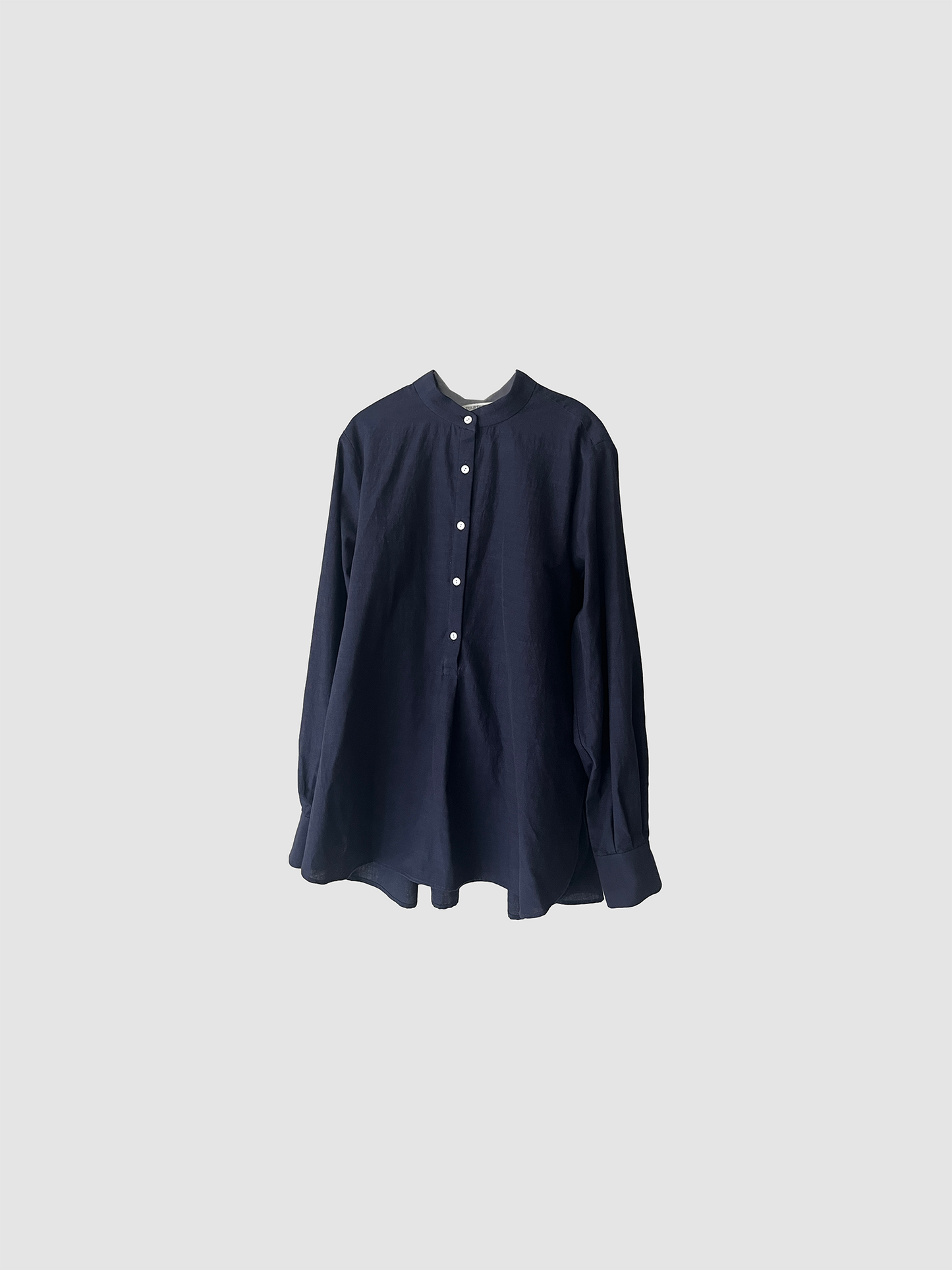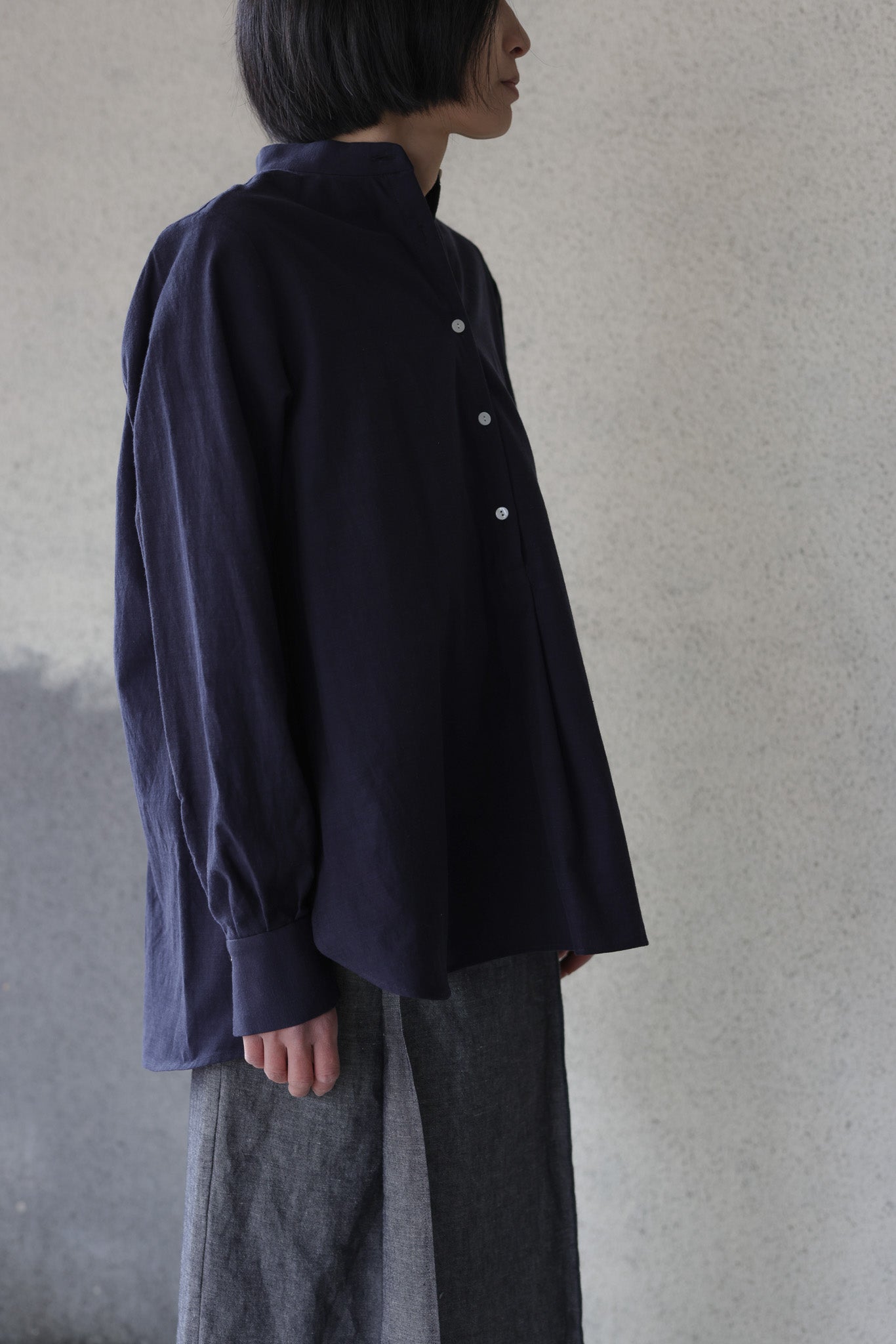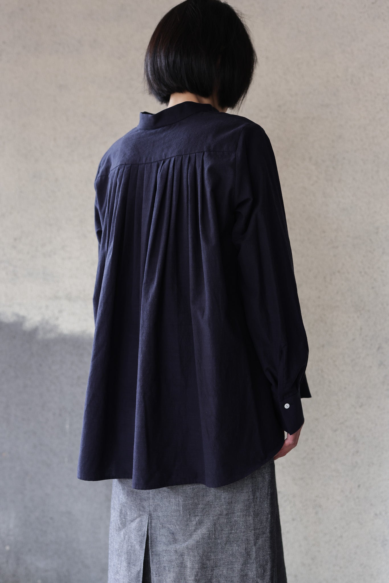 TULIP EN MENSENの定番の裾にかけて末広がりなAラインのスタンドカラープルオーバーブラウス。背中の切り替えにタックをたっぷりとはいり、程よくボリュームのありきれいなドレープが生まれます。首周り、肩周りはすっきりとしたパターンでボタンを開けて上品な佇まいです。裾周りは大きなカーブを描き、後ろが長いシルエットです。カフスは長めの作りになっているので袖の膨らみのコントラスを演出し、カフスを一折りしてアクセントにすることも出来ます。ボタンにはフラットな貝ボタンを使用しています。