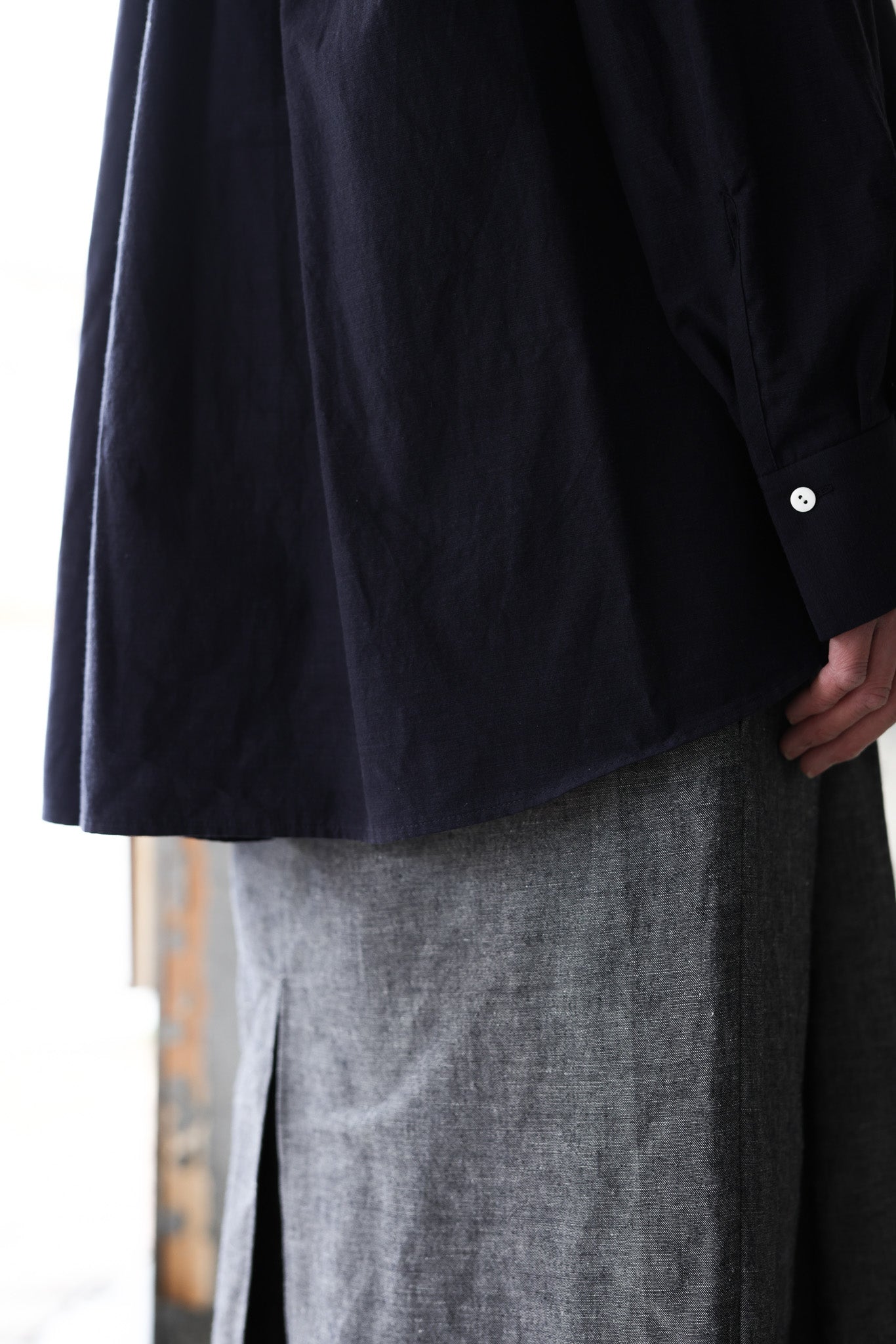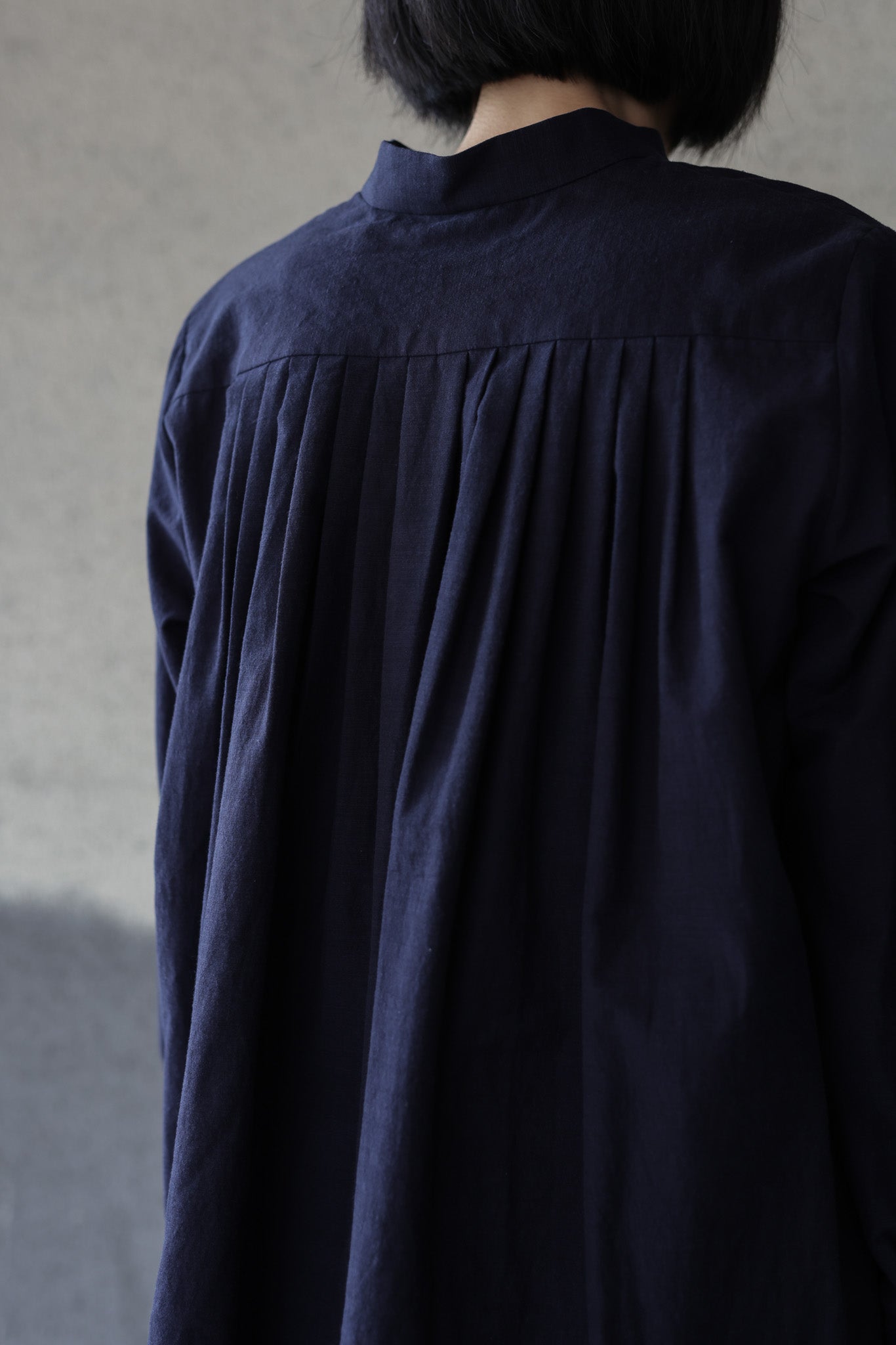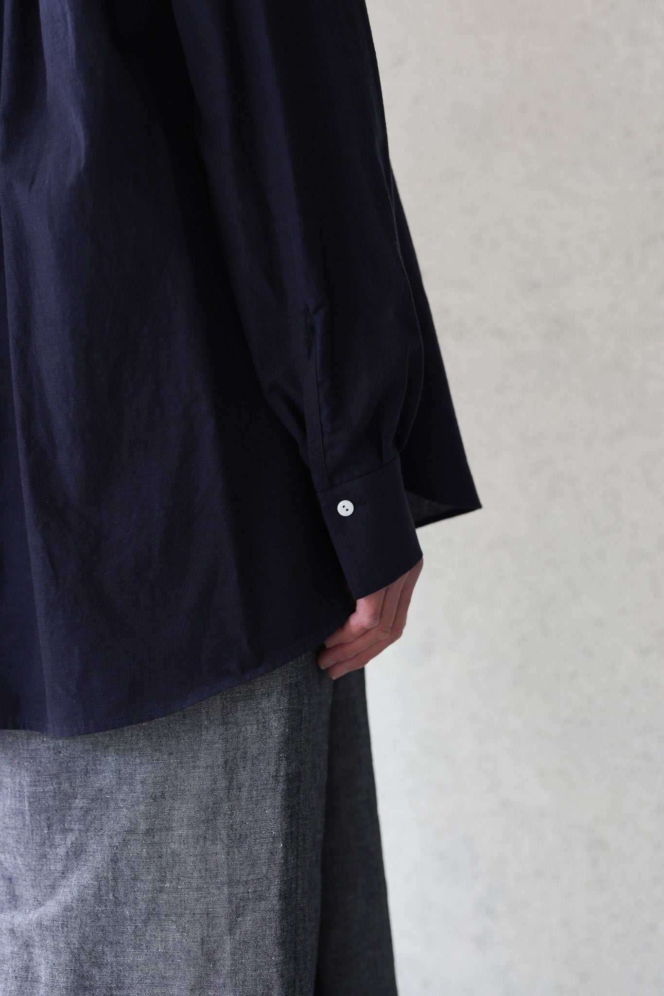 TULIP EN MENSENの定番の裾にかけて末広がりなAラインのスタンドカラープルオーバーブラウス。背中の切り替えにタックをたっぷりとはいり、程よくボリュームのありきれいなドレープが生まれます。首周り、肩周りはすっきりとしたパターンでボタンを開けて上品な佇まいです。裾周りは大きなカーブを描き、後ろが長いシルエットです。カフスは長めの作りになっているので袖の膨らみのコントラスを演出し、カフスを一折りしてアクセントにすることも出来ます。ボタンにはフラットな貝ボタンを使用しています。