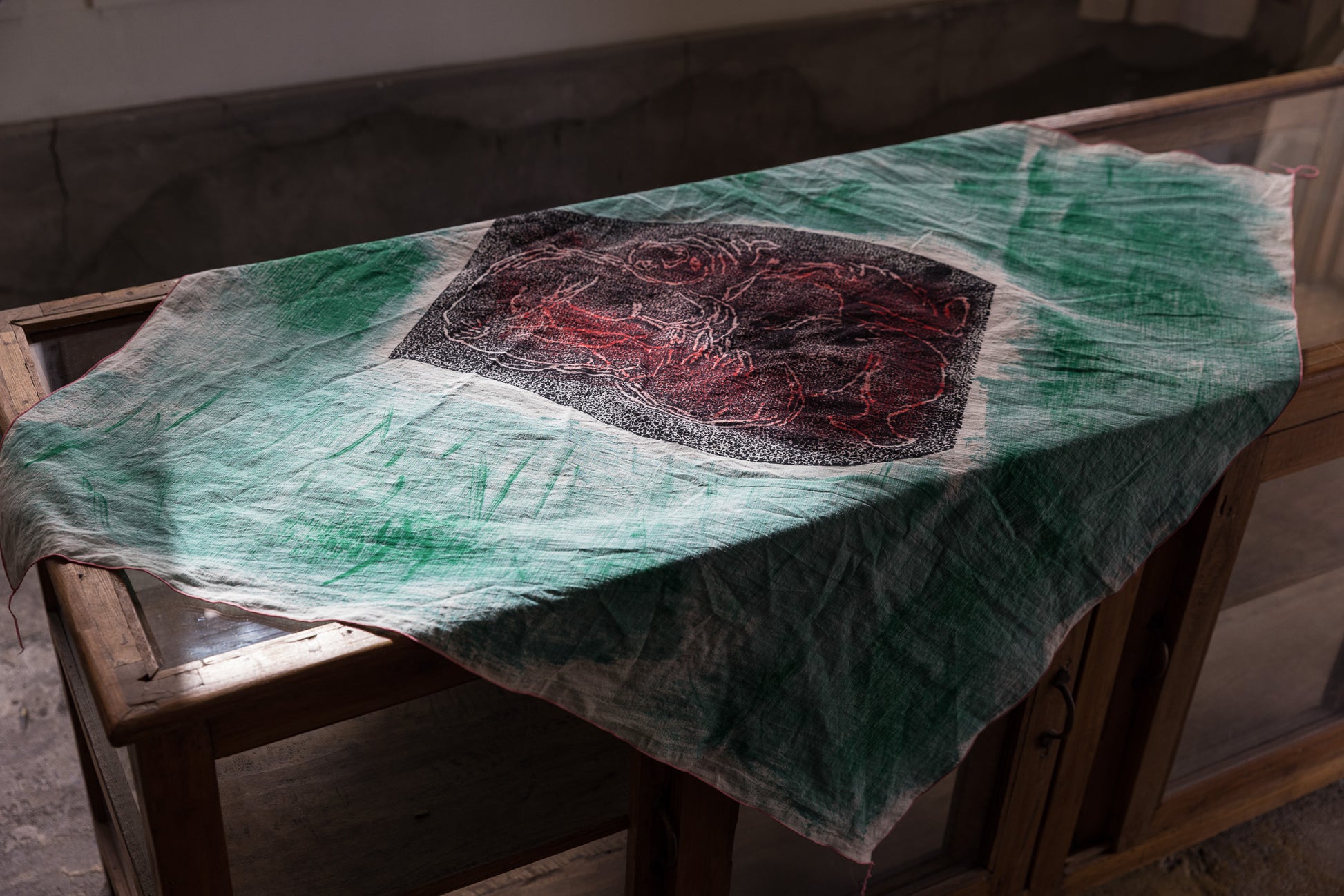版画と棟方志功の裏彩色を想像したコンセプチュアルなクロス