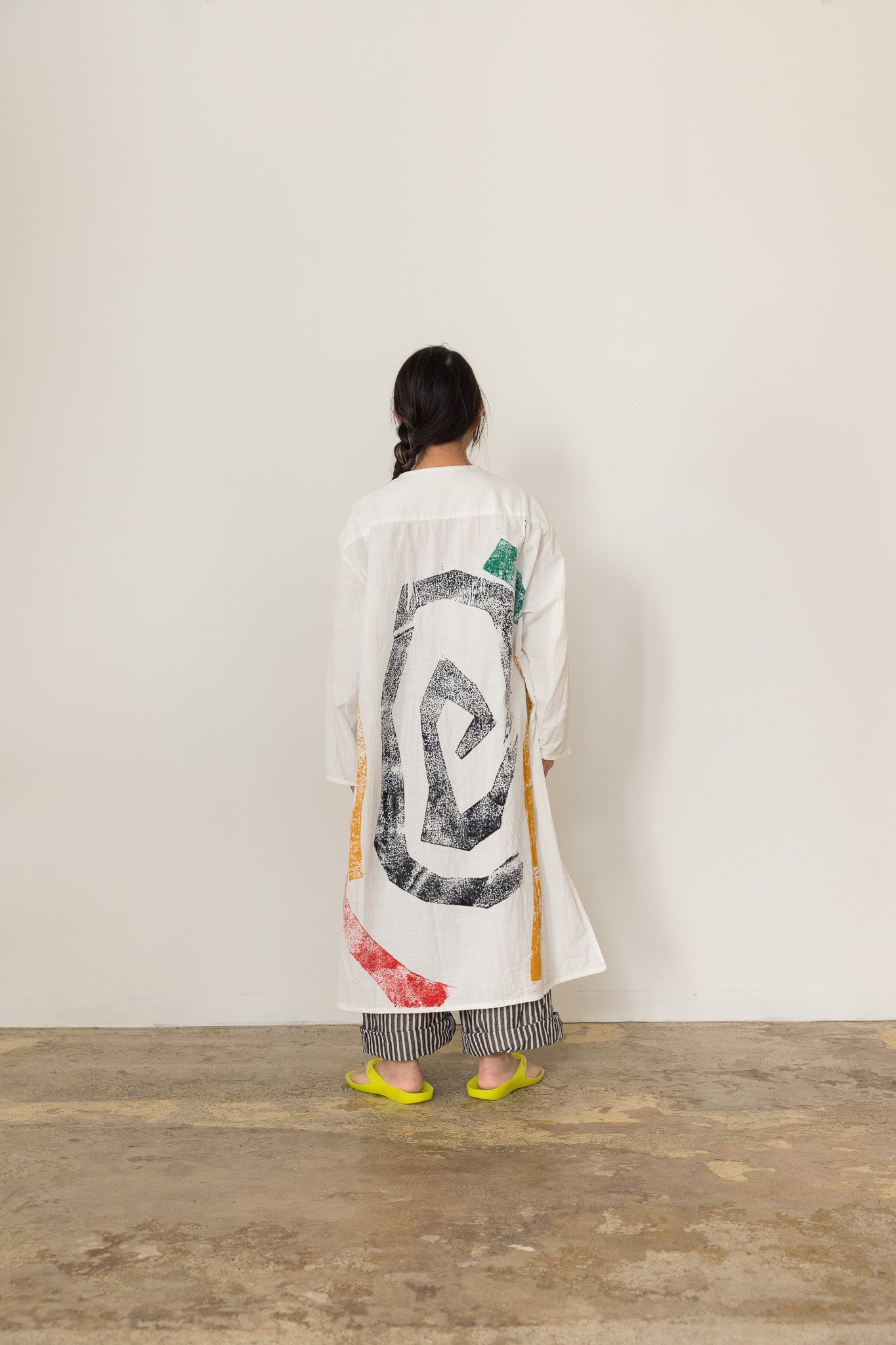 棟方志功にまつわることから着想を得て、モチーフを描きました。幾何学的なモチーフたちは至る所に散らばっています。棟方志功の裏彩色の技法を取り入れ、色を持った有機的なモチーフは体と服の間に居り主張します。優しい彩を放つモチーフを版に起こし、新潟県阿賀野市にある藤岡染工場にて、デザイナーがプリントしています。こちらは内側にプリントしています。