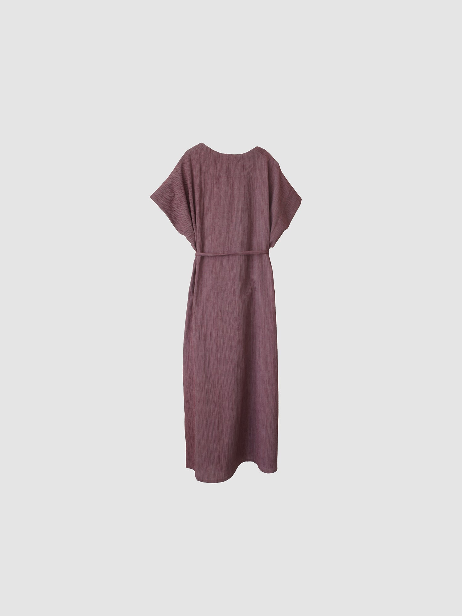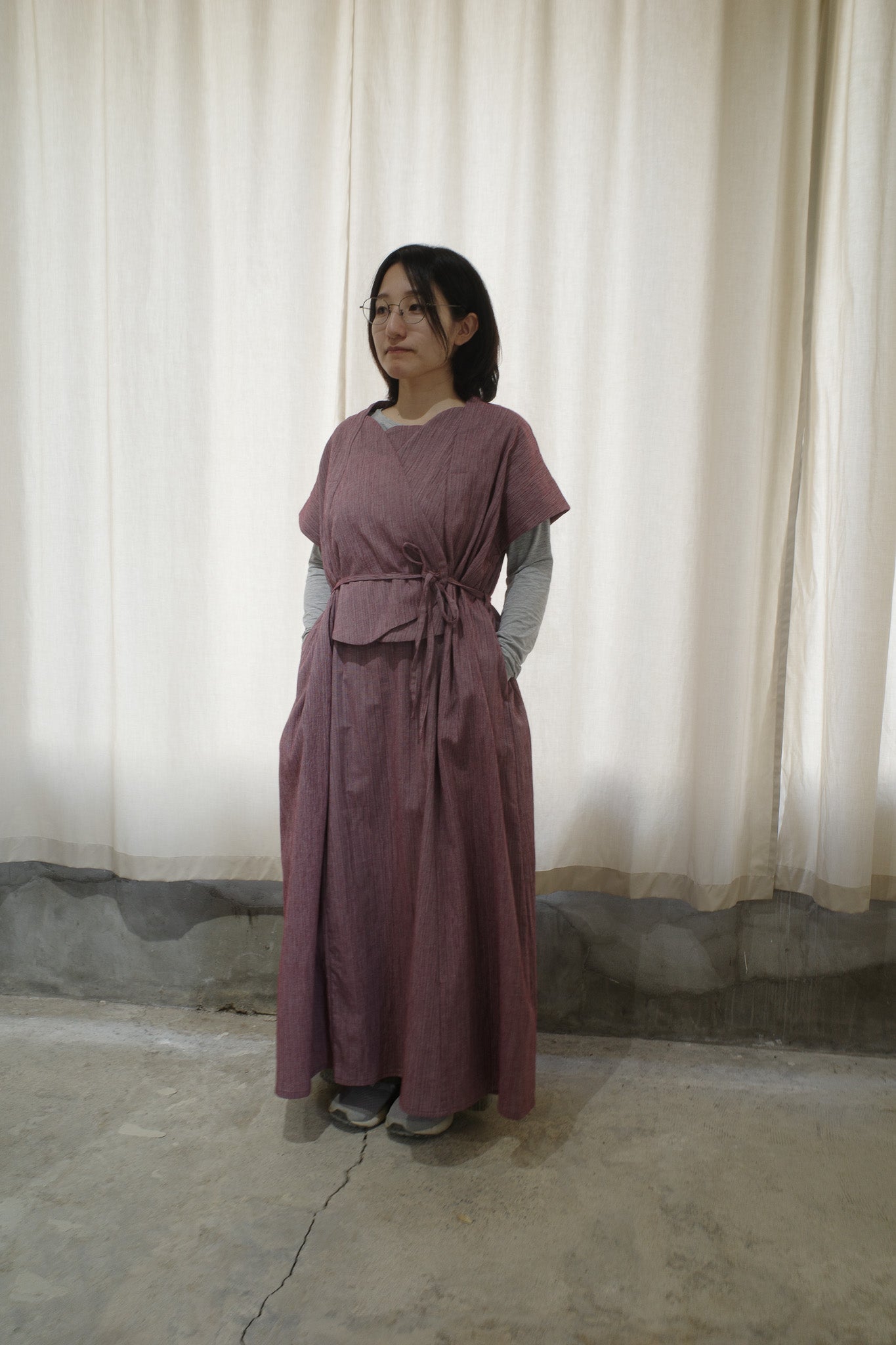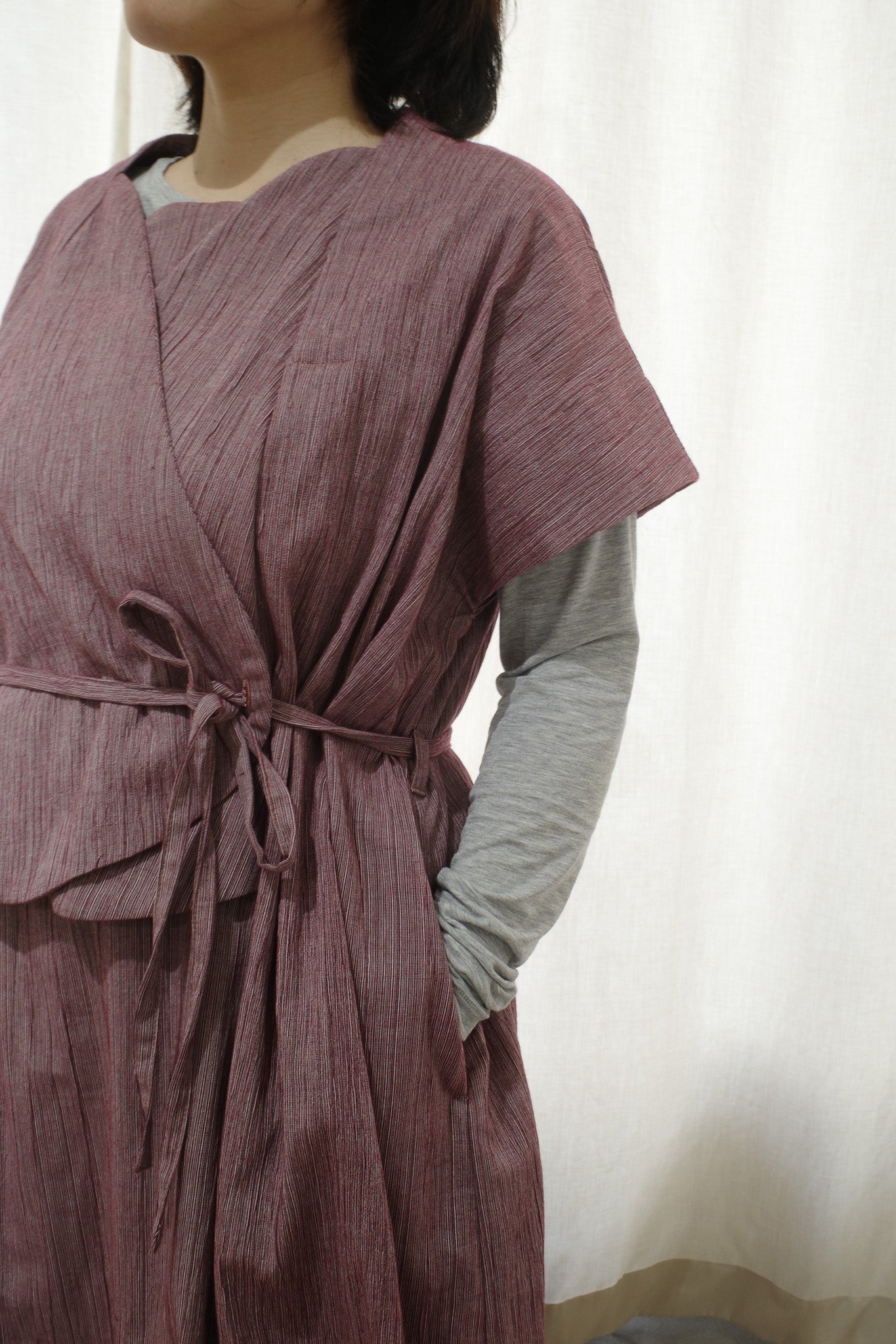 今回の Tulip[a]dress は Tulip dress と違いゆったりした見頃が特徴的で少し原始的な形を目指しました。それは夏に体を布の中で遊ばせるようなゆとりをたっぷりと残し、真夏の時期でも軽やかで心地良さを与えてくれ、縮み織りが融合したサマードレスが出来上がりました。