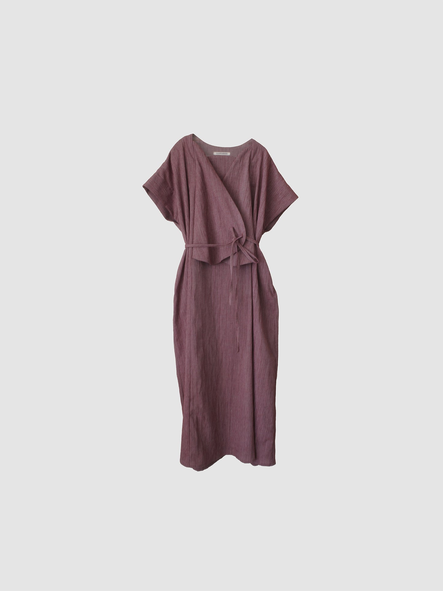 ブランドが始まってから作り続けているTULIP DRESSから派生して生まれた、凸凹とした縮みの生地を使用したハーフスリーブドレスで、チューリップの花びらがかさなったようなカシュクールスタイルやラペルが生まれるカラースタイル、飾りの花びらを後ろで紐を結んだエプロンスタイルの三通りの着こなしが可能です。