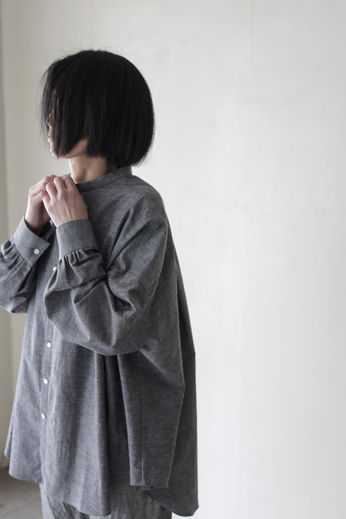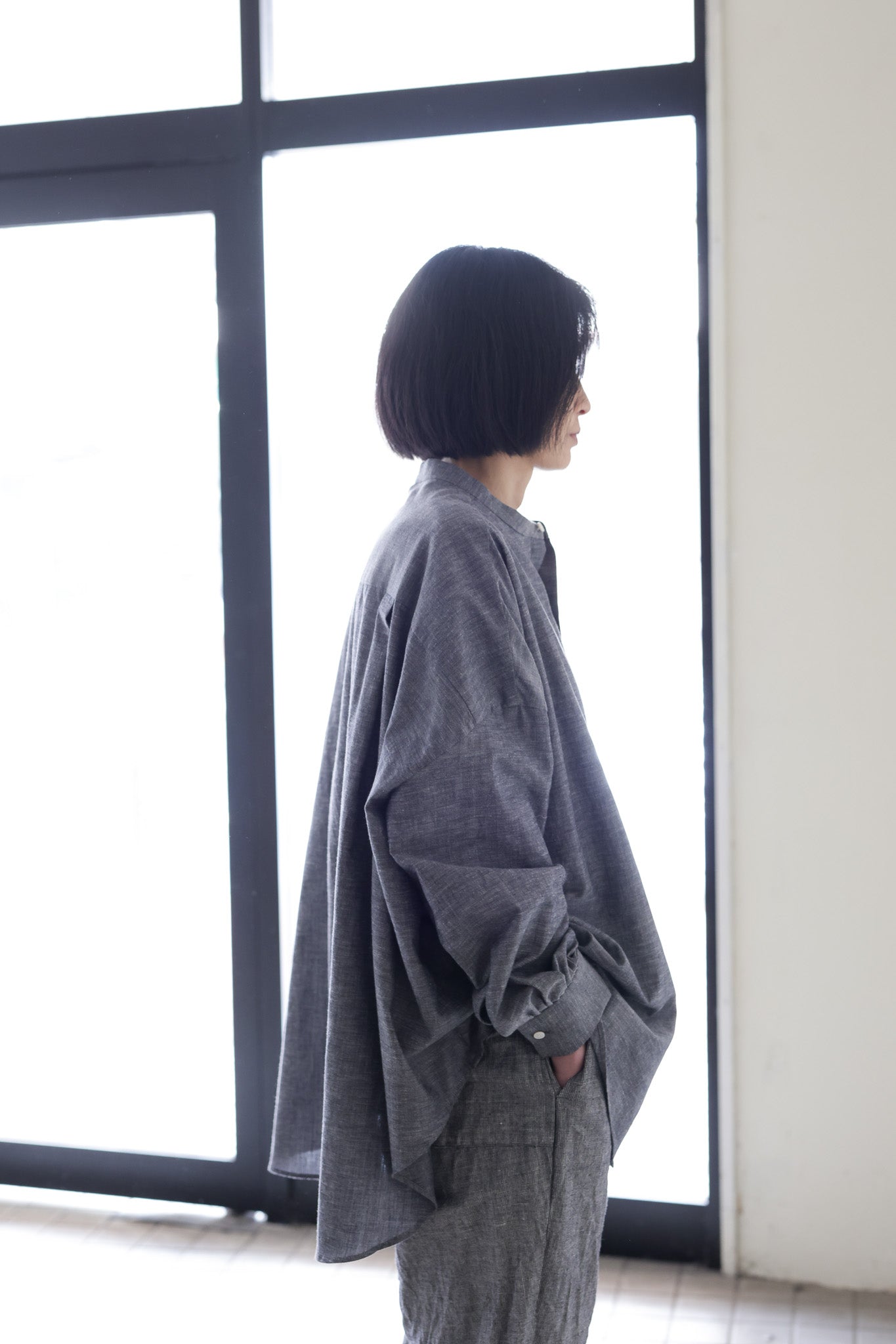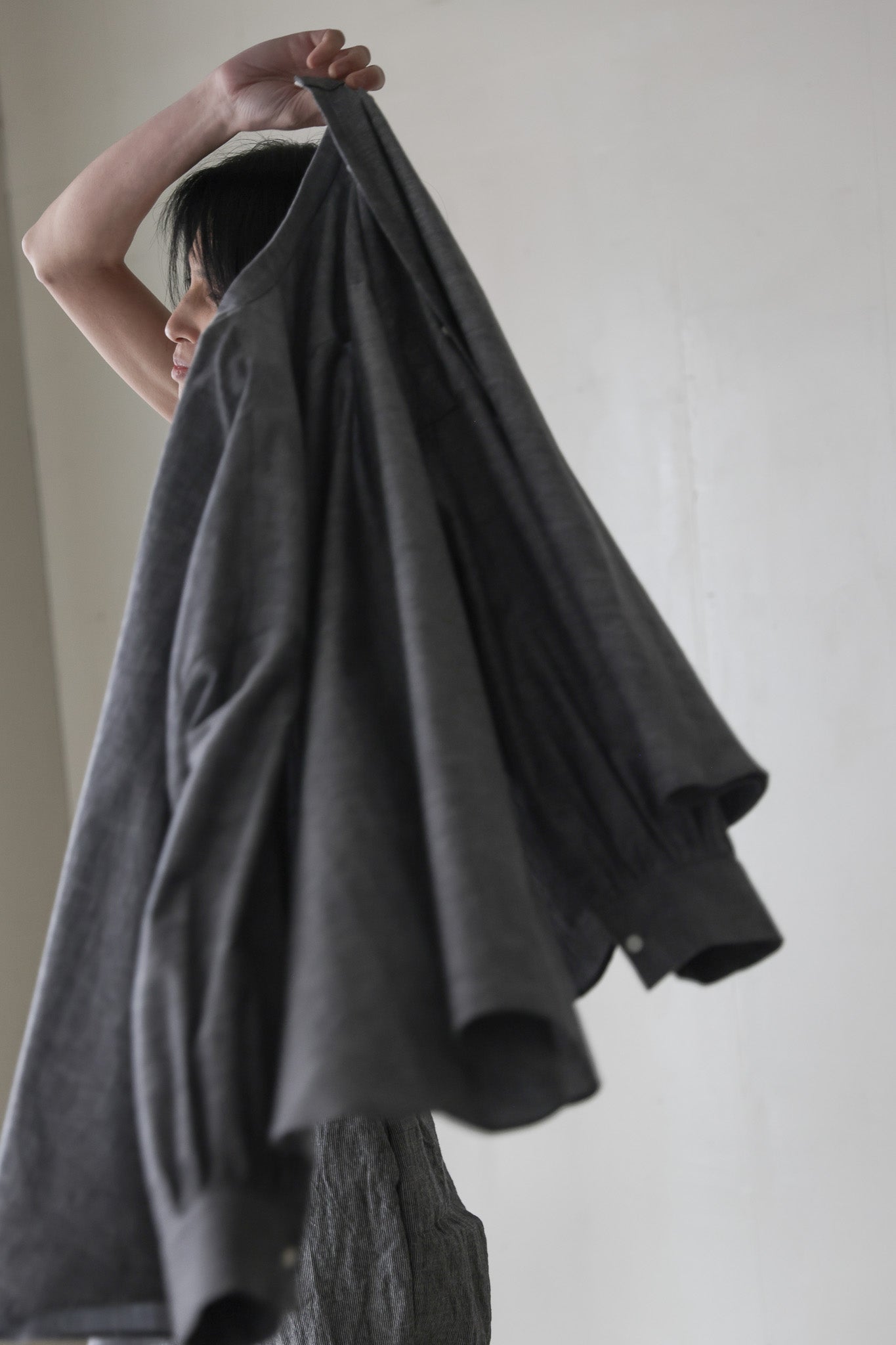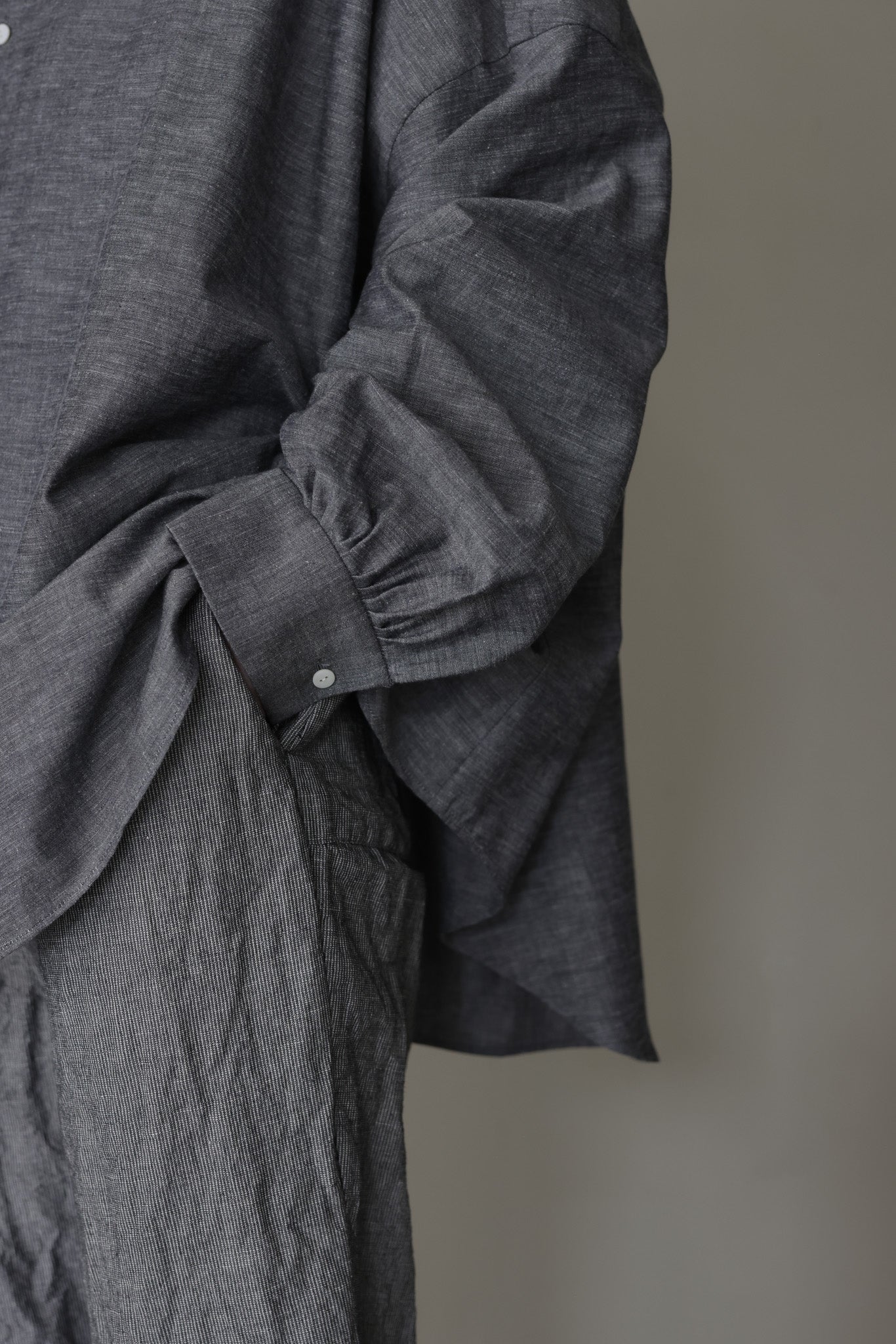 見頃が横に広がり、大きく開いた葉のようなシャツは、袖を通すと綺麗なドレープを生みます。シンプルのシャツのディテールを持ちながら、袖口にたっぷりとタックを寄せ、カジュアルでありながらさらりと独特なシルエットを持つこのシャツはコーディネートにこだわりを感じさせてくれます。ボタンにはフラットな白が際立つ貝ボタンを使用。