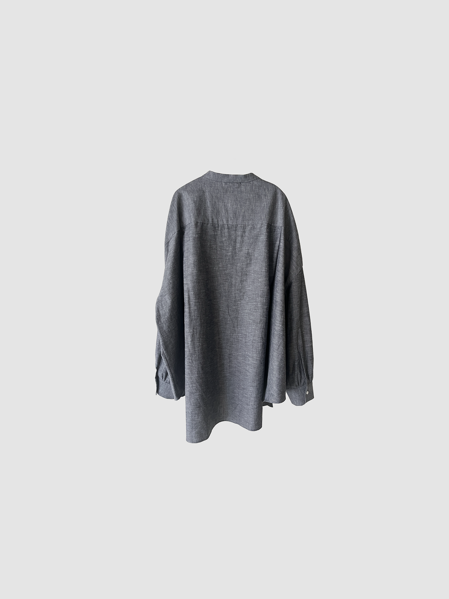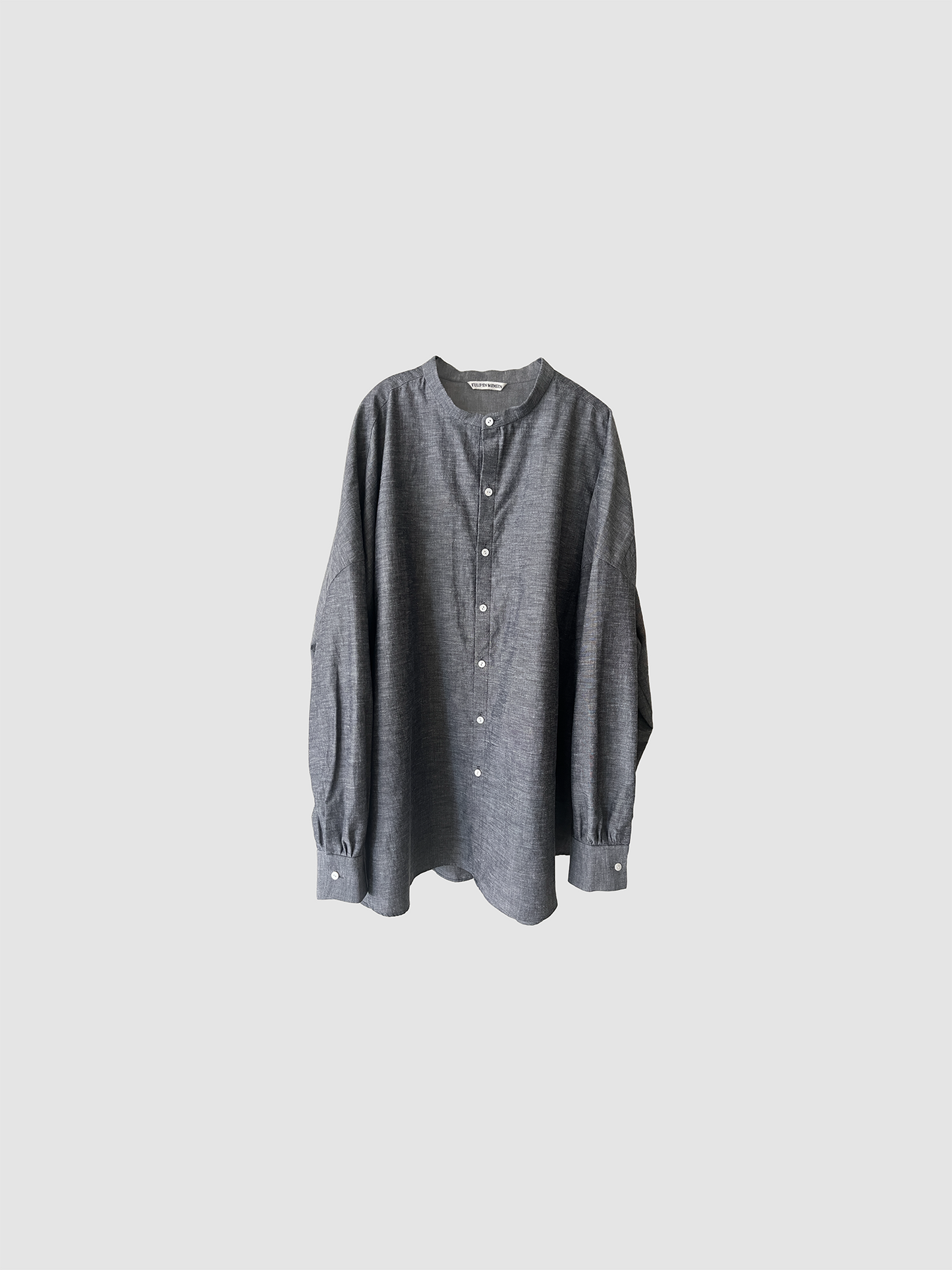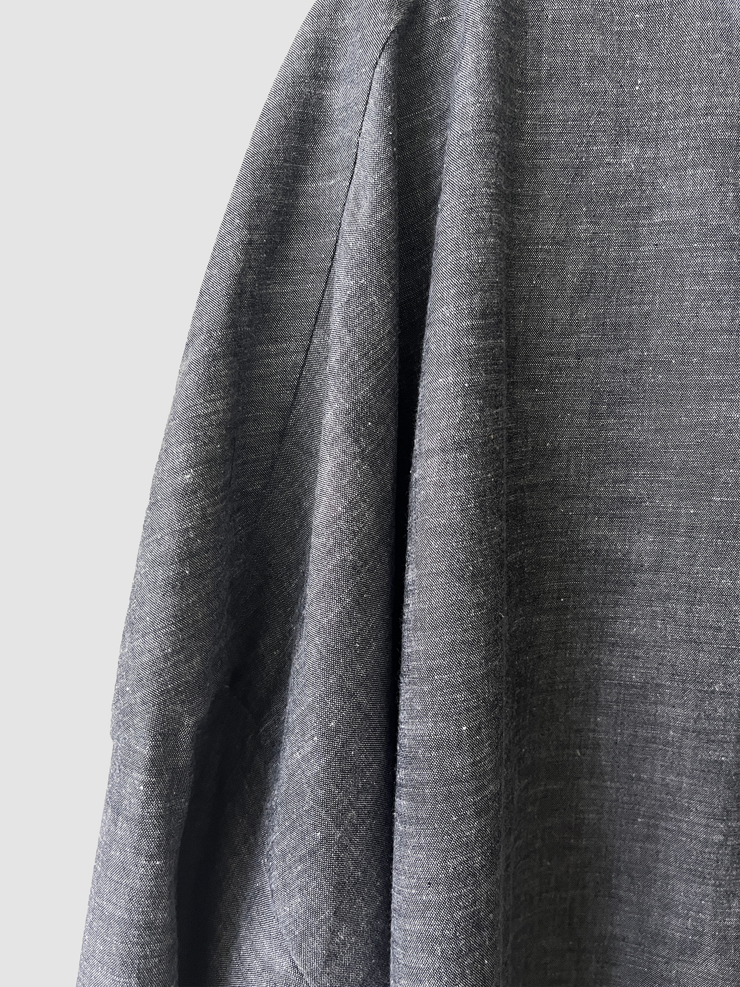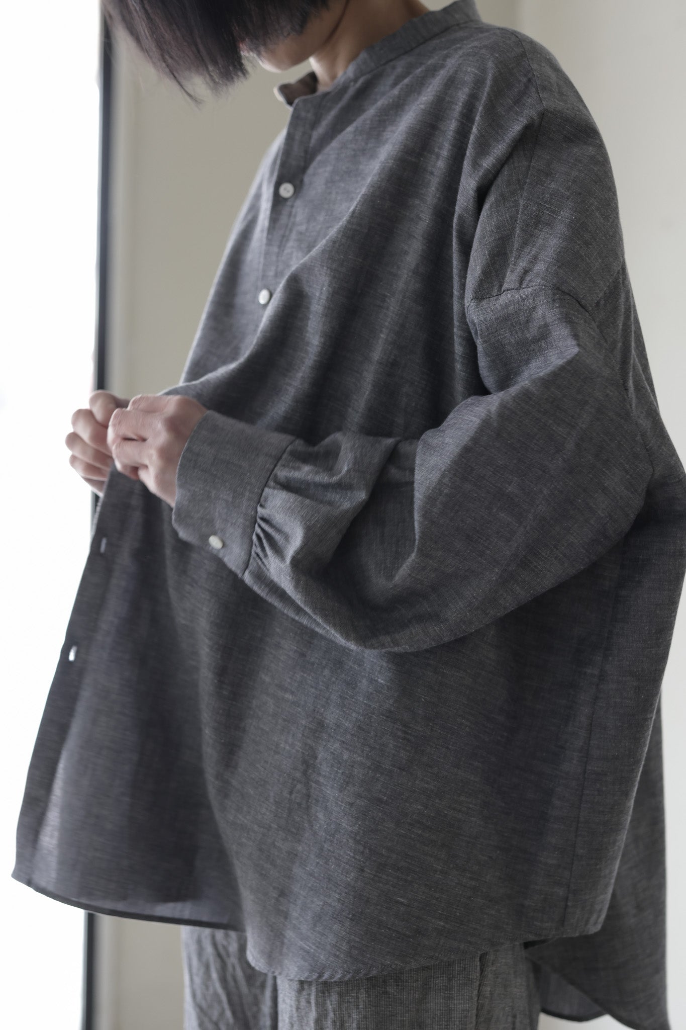 見頃が横に広がり、大きく開いた葉のようなシャツは、袖を通すと綺麗なドレープを生みます。シンプルのシャツのディテールを持ちながら、袖口にたっぷりとタックを寄せ、カジュアルでありながらさらりと独特なシルエットを持つこのシャツはコーディネートにこだわりを感じさせてくれます。ボタンにはフラットな白が際立つ貝ボタンを使用。